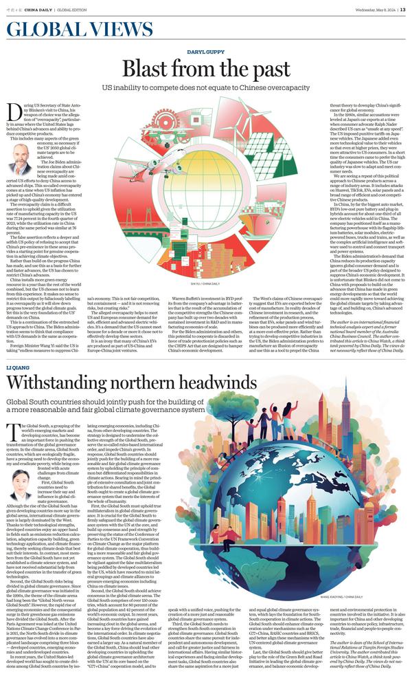5月8日,开云手机平台_开云(中国)国际关系学院院长李强教授在《中国日报》发表题为《全球南方国家应共同推动构建更加公正合理的全球气候治理体系》的文章。文章指出,全球南方国家需要提升在全球气候治理领域的话语权和影响力;全球南方国家在全球气候治理中面临阵营分裂风险。为此,全球南方国家需要一是在全球气候治理中坚持践行真正的多边主义;二是在全球气候治理中形成一个声音说话;三是加强全球气候治理的南南合作;四是充分发挥共建“绿色一带一路”引领全球气候治理实践的作用,以绿色发展为引领,注重协调沿线国家经济社会发展与生态环境保护的关系,加强中国与广大发展中国家之间的政策沟通、设施联通、贸易畅通、资金融通、民心相通。全文转载如下:Global South countries should jointly push for the building of a more reasonable and fair global climate governance systemThe Global South, a grouping of the world's emerging markets and developin