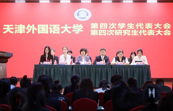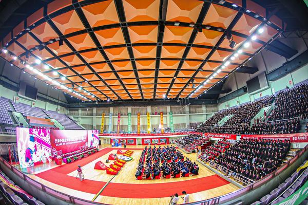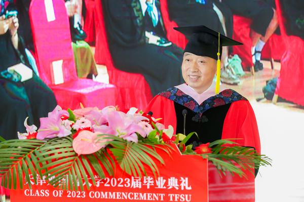 中外求索征程启,德业竞进意气扬。6月15日下午,我校2023届学生毕业典礼在马场道校区体育馆隆重举行,全体校领导、校学位评定委员会委员代表、相关部门、各学院负责同志、导师代表、校友代表及2023届毕业生参加了典礼。 毕业典礼现场 歌曲快闪 奏唱国歌校歌 毕业生记录精彩瞬间 一首《追光者》“快闪”拉开了典礼的帷幕,《再见》《凤凰花开的路口》点燃了现场浓郁的毕业氛围。31种外文书写的毕业祝福环绕四周,乘风破浪的景观小船象征着毕业生扬帆远航。各学院精心制作的视频《盛夏》、毕业视频《圆》让毕业生们热泪盈眶,满怀感动奔赴未来。 校党委书记周红蕾为毕业生代表颁发奖牌 校党委书记周红蕾为毕业生授旗 主席台领导为2023届校友联络人颁发聘任证书 校党委书记周红蕾为毕业生先进典型和基层就业优秀代表颁发纪念奖牌,并为毕业生授旗,希望全体毕业生胸怀“国之大者”,肩负民族复兴重任,展现天外力量和担当。主席台领导为2023届校友联络人颁发聘任证书,希望他们成为母校精神的传播者和校友感情的联络者,为母校和校友的共同发展贡献力量。 校长陈法春讲话 校党委副书记、校长陈法春以“沐光致远 晖光日新