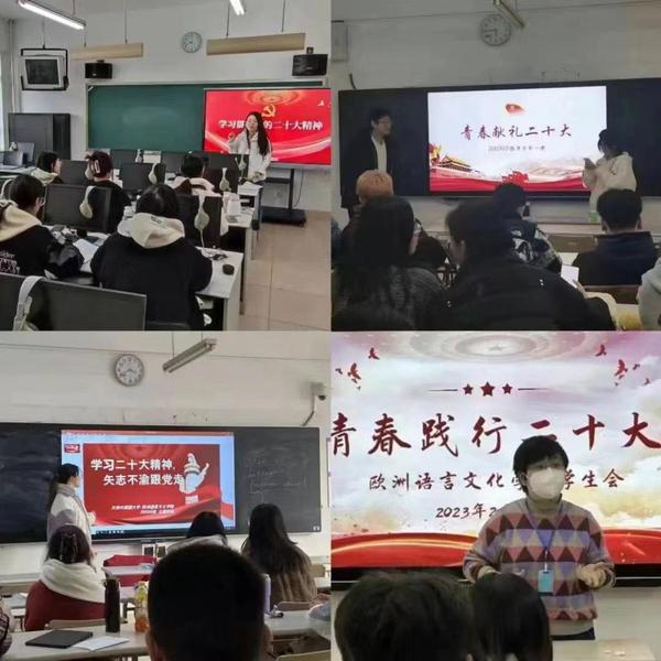 为落实校党委主题教育有关部署,切实把师生的思想和行动统一到习近平总书记重要讲话精神和党中央决策部署上来,确保取得实效,欧洲语言文化学院结合自身特点,积极把主题教育开展在教育教学一线,以实际行动奋力谱写人才培养新篇章。 开新局 为深入贯彻落实党的二十大精神,学院以“青春践行二十大”为主题,在全院范围内开展了“开学第一次主题班会”,辅导员全员参与。班会围绕“爱国、团结、奋斗、科学、互助”五个关键词展开,同学们各自分享假期所见所闻以及新学期的规划。围绕成长困惑以及就业、升学等问题,辅导员提供了有针对性的引导和解答。主题班会还通过组织参观“非凡十年”图片展,帮助学生厚植家国情怀,涵养进取品格。“开学第一次主题班会”的开展,进一步深化了同学们对党的二十大精神的理解,有力地引导学生立大志、明大德、成大才、担大任的意识,激励学生坚定听党话、跟党走的信念,不断践行“请党放心,强国有我”的青春誓言。 《习近平外交思想》课程教材 上新课 按照天津市教委统一部署,学院于2023年春季学期开始增设专业必修课-《习近平外交思想》,授课对象为本科二年级学生,1学分,16学时。该课程旨在引导学生结合外语专业