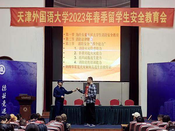 为加强留学生中国法律教育,提高留学生遵纪守法意识和个人安全意识,规范校内外留学生行为,维护安全稳定,3月17日下午,国际教育学院在钟楼报告厅召开了“2023年春季留学生安全教育会”。会议邀请了天津市出入境管理局、天津市公安局河西分局、天津市五大道消防救援站的警官及我校国际交流中心负责人为留学生进行相关法律、消防和住宿安全宣介。会议由国际教育学院副院长代秀敏主持,国际教育学院党总支书记孙倩出席会议并讲话,留学生办公室全体留管干部、在校留学生参加会议。孙倩对留学生入境返校表示欢迎,介绍了新学期留学生教育管理的总体安排和要求,着重强调了法制和安全教育的重要性,同时鼓励同学们努力学习、积极参与学院组织的各类学术和文化活动,争先创优。出入境警官介绍了我国出入境管理法以及留学生在华签证的相关规定,对外国人在中国境内应遵守的相关法律法规进行了重点分析介绍,现场解答了学生们关于签证延期、就业创业等普遍关心的问题。五大道消防救援站的警官介绍了火灾的基本知识、火灾的危害、火灾扑救和逃生常识,演示了灭火器和消防栓的使用方法,提醒学生提高消防安全意识,养成良好的消防安全习惯。国际交流中心于经理全面详细地介绍了