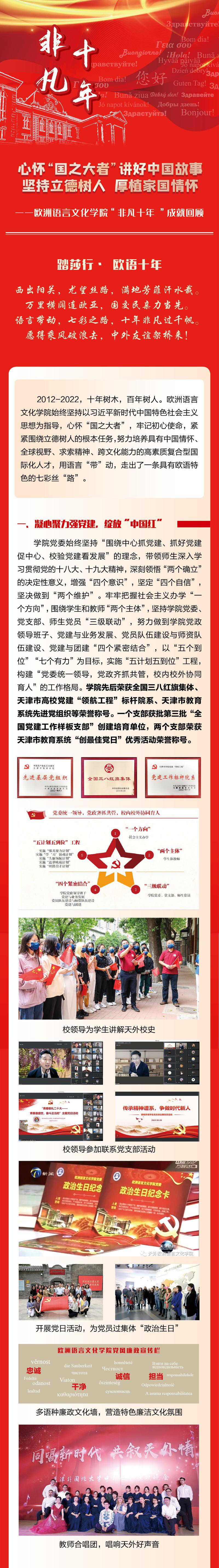 岁月不居,时节如流。2012-2022十载春秋,日语学院在“中外求索,德业竞进”校训精神的指引下,不息为体,日益鼎新,在学校党委的正确领导下,经过全体师生的不懈奋斗,取得了辉煌成就。 一、党的建设全面持续推进 日语学院文化系教师党支部获批“全国党建工作样板支部”、“天津市党建“领航工程”样板支部 天津市优秀共产党员 优秀共产党员 课程思政建设取得突破 “先锋成长营精英团校”荣获全国高校践行社会主义核心价值观“示范团支部”称号 获批高校共青团“四进四信”活动基层优秀项目 二、师资队伍质量明显提升 近十年,日语学院先后有24人次获省部级人才称号,13人次获校级人才称号。 师资队伍 专业教师屡夺全国教学大赛冠军 天津市三八红旗集体称号 工人先锋号 日语学院喜获“全国教育系统先进集体”荣誉称号 获批劳模创新工作室 近年来,日语学院获批教育部外语教学指导委员会日语分委会主任单位,集全国教育系统先进集体、天津市“五一”劳动奖状先进集体、天津市“工人先锋号”、天津市师德建设先进单位、天津市三八红旗集体等众多荣誉于一身。 三、学科专业建设持续优化 拓展博士研究生教