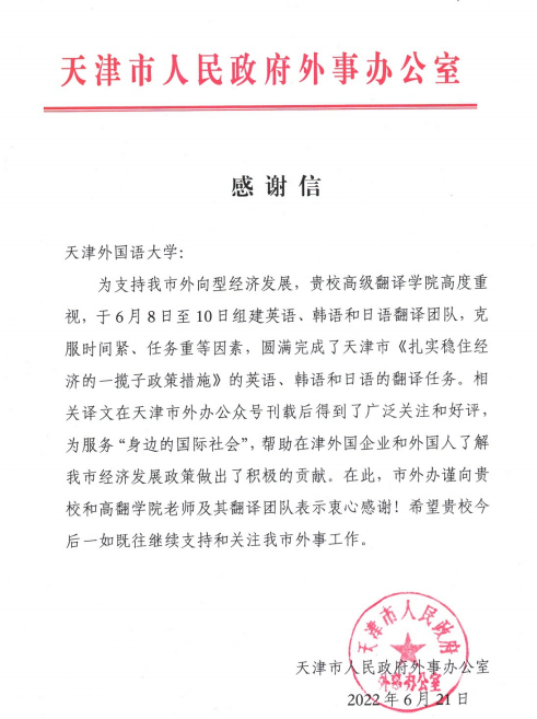日前,我校收到天津市人民政府外事办公室发来的感谢信,表达了对高级翻译学院翻译团队圆满完成天津市《扎实稳住经济的一揽子政策措施》重要翻译任务的感谢。6月8日,高级翻译学院接到天津市外办委托后,迅速组建了以院长李晶领衔的英日韩翻译团队,立即投入到紧张的翻译任务中。经过两天夜以继日的工作和数次认真校对修改,翻译团队于6月10日准时提交英文、日文和韩文翻译稿。《扎实稳住经济的一揽子政策措施》是天津市助力企业恢复发展、帮助群众克服疫情带来的困难以及统筹疫情防控和经济社会发展的关键之举,旨在最大限度减少疫情对经济社会发展的影响,切实把经济稳住,努力实现全年经济社会发展预期目标。外文版的发布,有利于在津外国企业和外国人了解我市经济发展政策,有助于更好地服务“身边的国际社会”。长期以来,高级翻译学院与天津市外办开展友好合作,圆满完成金砖国家部长级会议文件、外交部全球推介会、世界智能大会等重要活动的口笔译任务。特别是抗击新冠肺炎疫情以来,已累计完成二十余万字200余篇新闻报道的多语种笔译任务,并选派多批教师和研究生赴机场、海关防疫一线提供现场口译服务,为“外防输入,内防扩散”做出了重要贡献。未来,双方将