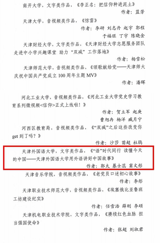 日前,由市教育两委组织开展的2021年天津市“十大教育新闻作品”评选活动结果公布。由我校报送的《“语”时代同行 读懂今天的中国------开云手机平台_开云(中国)用外语讲好中国故事》成功获评。 文章聚焦开云手机平台_开云(中国)将党史学习教育融入教育教学实践,不断加强对外话语体系创新研究,结合高校自身特色,发挥语言服务优势,聚焦国际传播能力建设,勇担外宣使命和职责,向世界讲述中国故事,传播好中国声音。从“在‘翻译’中讲好中国”“在‘教学’中理解中国”“在‘行走’中感悟中国”三个方面,展示了学校党和国家重要文献外译成果、《习近平谈治国理政》多语种版本“三进”工作成效,以及培养“知华、爱华、友华”国际人才的重要成果。 今后,我校将继续围绕教育改革发展中心工作,做好教育新闻内容生产,按照“人在哪里,新闻舆论阵地就应该在哪里”的要求,进一步加强正面议题设置和新闻策划,突出融媒体作品生产,创新方法手段,努力打造更多讲述“天外教育故事”的宣传精品,进一步提升学校教育新闻舆论传播力、引导力、影响力、公信力,为学校教育改革发展提供精神动力和舆论支持。 原文转载如下: “语”时代同行 读懂今天的中国 ------天津外