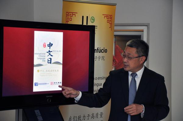 中方院长介绍中文日活动 葡方院长讲话为书写比赛获奖者颁奖为写作比赛获奖者颁奖丹妮朗读参赛作品获奖学生合影为庆祝2022年“国际中文日”,里斯本大学孔子学院于当地时间4月21日举办了第一届“我爱学中文”汉字书写比赛和第二届《我学习汉语的故事》中文写作比赛颁奖活动。来自里斯本大学文学院、孔子学院社会班以及圣托马斯孔子课堂的68名学生提交了参赛作品。经过严格评审,中文写作比赛共评出一等奖1名,二等奖2名,三等奖4名。汉字书写比赛分为两组,成年组共评出一等奖3名、二等奖4名、三等奖6名;少年组评出一等奖2名、二等奖3名、三等奖5名。孔子学院中方院长和葡方院长为获奖学生颁发了证书和奖品。中方院长王锦程向获奖的学生们表示祝贺。他指出,今年4月20日是第13个国际中文日,联合国教科文组织举办了形式多样的线上和线下庆祝活动。中文是迄今为止仍在使用的最古老的语言之一,对促进多元文化发展、跨文化交流以及持久和平做出了卓越贡献。他为在场的学生讲述了仓颉造字的传说以及汉字发展的历史,并表示,今年在举办第二届中文写作比赛的同时,还增加了汉字书写比赛,目的是希望更多的学生喜欢汉字,学好中文。孔子学院葡方