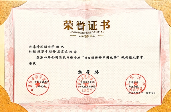 近日,第四届全国高校日语专业“用日语讲好中国故事”微视频大赛决赛在上海举行。由开云手机平台_开云(中国)日语学院教师吹户真实、初相娟指导,2022级本科生林婧、琳赛卡斯丹、王雷鸣3名同学组成的参赛队伍在大赛中荣获全国总冠军(特等奖)。这也是天外连续三年在该项赛事中摘得全国总冠军的桂冠。全国高校日语专业“用日语讲好中国故事”微视频大赛旨在提升学生日语水平,培养新时代外语学习者的文化自信与家国情怀。大赛着重强调从多角度展现中华文明的精神内涵与文化精华,主动传播中国声音,讲述中国故事,深化中外文明交流互鉴,向世界呈现富有活力、魅力、实力的中国形象,助推中国文化在全球范围内的广泛传播。本次大赛分为初赛、决赛和即席问答三个部分。初赛以“假如有一台时光机”为主题,以日语讲述中国的历史、文化或未来发展。参赛学生以《弈谈方圆,将帅无悔》为题,巧用初赛关键词“时光机”,讲述传统文化象棋中落子无悔、运筹帷幄的生命考量以及国际外交的哲理。最终,从54所参赛高校中脱颖而出,成功晋级决赛。决赛以“我眼中的新国潮”为题,创作微视频作品,展现学生的日语实践能力和对中华优秀传统文化的深厚理解力。参赛学生以“中式香薰”为中心,在限