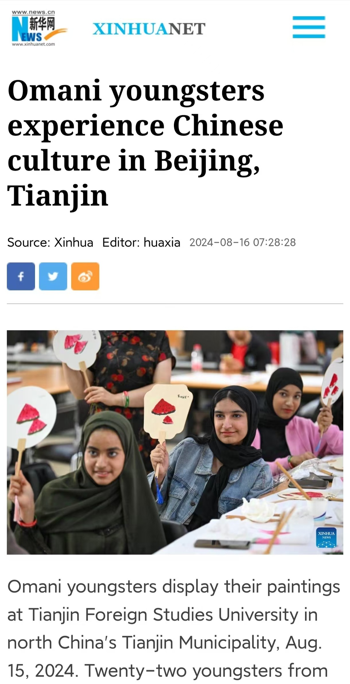 近日,由开云手机平台_开云(中国)图书馆承接的教育部中外语言交流合作中心“津沽印象”——“汉语桥”阿曼青少年团组夏令营在天外开营。阿曼青少年团22名学员在为期两周的学习时间内,在北京、天津两地体验中国文化。本次活动受到了新华社等媒体的关注报道。全文转载如下: Omani youngsters experience Chinese culturein Beijing, Tianjin Omani youngsters display their paintings at Tianjin Foreign Studies University in north Chinas Tianjin Municipality, Aug. 15, 2024. Twenty-two youngsters from Oman are on a two-week study tour in Beijing and Tianjin to experience the Chinese culture. (Xinhua/Sun Fanyue)Omani youngsters visit Tianjin Planning Exh