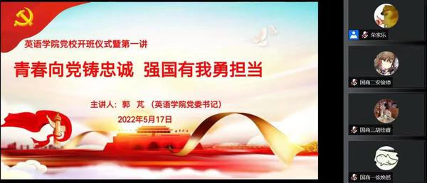 为认真学习贯彻“迎盛会、铸忠诚、强担当、创业绩”主题学习宣传教育实践活动及“青春献礼二十大 奋斗担当铸忠诚 强国有我新征程”主题宣传教育活动的工作要求,英语学院党委于5月17日中午举办了党校开班仪式暨首场党课。学院党委书记郭芃主讲,全体毕业生党员及积极分子参加。   郭芃带领党校学员共同学习了习近平总书记在中国人民大学考察时的重要讲话精神、在庆祝中国共产党成立100周年大会上的重要讲话精神,以及在中国共产主义青年团成立100周年大会上的重要讲话精神,阐述了新时代赋予青年的历史责任;结合东西方国家抗击新冠肺炎疫情的举措和效果,分析了中国和西方国家制度的本质区别,强调中国特色社会主义制度的优越性,引导青年学子听党话、跟党走,在亲身经历的“百年未有之大变局”新时代历史进程中,发挥党员的模范带头作用。他号召广大青年学子志存高远、胸怀天下,以坚定的理想信念和扎实的专业知识,从老一辈手中接过接力棒,将青春奋斗融入党和人民事业,在实现民族复兴的赛道上奋勇争先,呈现青年一代的风采,迸发青年一代的光谱和能量。 英语学院党校后续将以集中授课、演讲比赛、实践活动、交流研讨、线上观影等方式开展,进一步引导学员