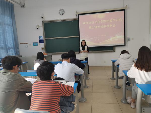 为新教工讲授“师德必修课”为全体教师宣讲《教育法》多语廉政文化墙 为全面贯彻习近平总书记关于教育的重要论述和全国教育大会精神,深入落实校党委关于开展师德专题教育的相关工作部署,教育引导全体教师用习近平新时代中国特色社会主义思想武装头脑,教育引导广大教师筑牢“为党育人、为国育才”根基,争做“四有”好老师,欧洲语言文化学院党委以“三个引领、一条红线”为抓手,将师德师风建设融入日常、抓在经常,常态化抓好师德师风建设,以优异成绩向建党百年献礼。 坚持思想引领。学院党委持续落实好教师理论学习制度,充分利用教育部师德专题教育网页资料,围绕明师德要求、强党史教育、学师德楷模、遵师德规范、守师德底线等 五大方面,学院班子通过党委会、中心组学习等形式先学一步、学深一步,学院纪委书记在全体会上通报教育部曝光的8起违反教师职业行为十项准则典型案例;师德宣传教育月期间,组织学院教师观看《习近平与教师们在一起》电视专题片、《习近平论人民教师》《习近平的师生情》等文章,常态化抓好教师师德师风学习教育,切实融入日常、抓在经常,提高广大教师政治素养和师德涵养。 坚持党建引领。学院党委书记,党委委员、副院长(主持工作)