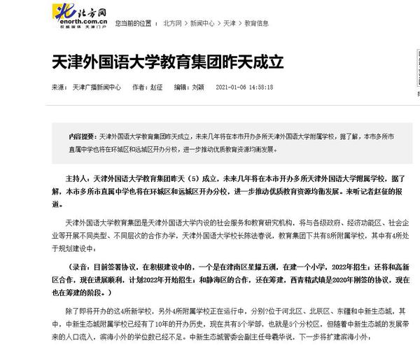 1月7日,天津广播以《最新 | 天津有8所“小外”了!地点、招生时间公布!》为题目进行了报道。