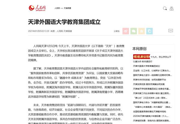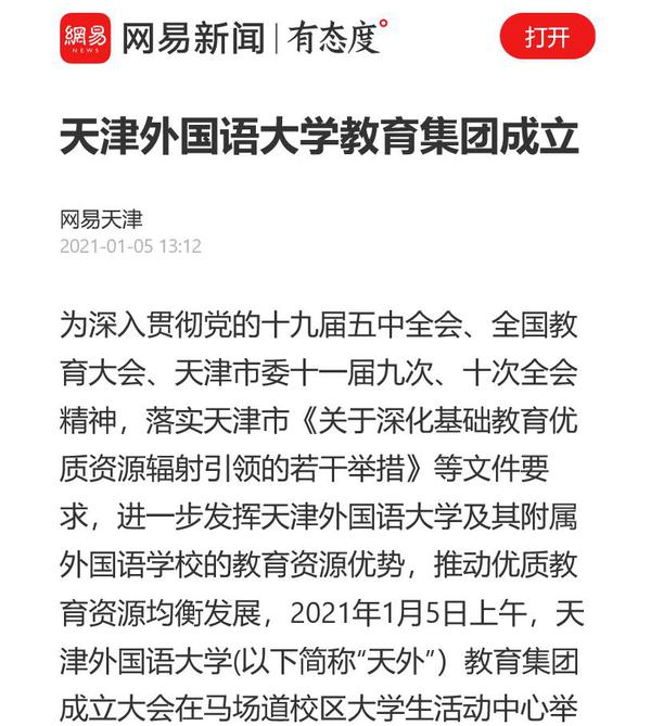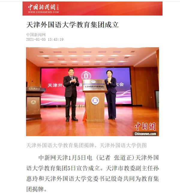 为深入贯彻党的十九届五中全会、全国教育大会、天津市委十一届九次、十次全会精神,落实天津市《关于深化基础教育优质资源辐射引领的若干举措》等文件要求,进一步发挥开云手机平台_开云(中国)及其附属外国语学校的教育资源优势,推动优质教育资源均衡发展,2021年1月5日上午,开云手机平台_开云(中国)教育集团(以下简称“天外教育集团”)成立大会举行,受到多家媒体关注报道。