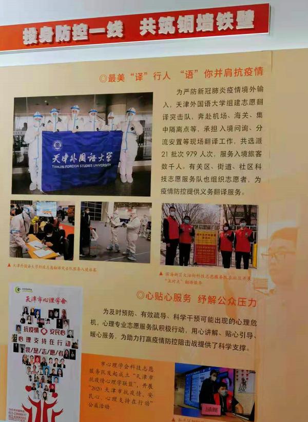 近日,由天津市科学技术协会主办的“不忘初心担使命,津门战疫当先锋”天津市科技工作者抗疫风采展在天津科技馆举办。其中,“科技志愿服务”部分以《最美“译”行人 “语”你并肩抗疫情》为题展示了天外志愿翻译突击队在机场、海关等开展现场翻译的照片,获得参观者的一致称赞。