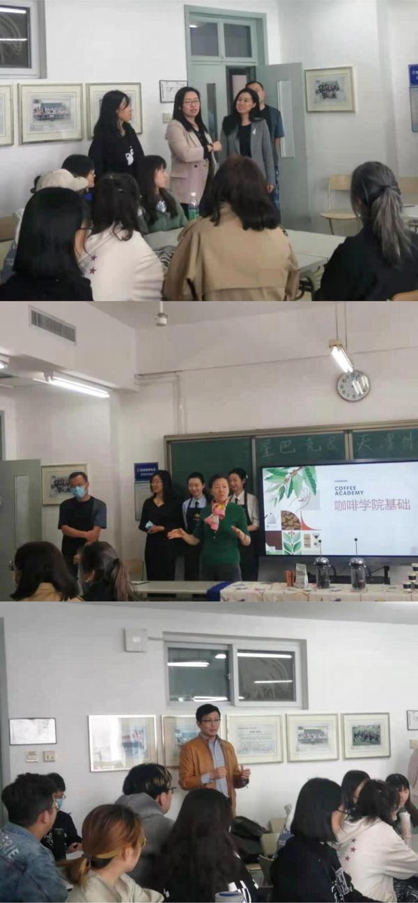 为提升我校大学生素质技能培养,丰富课程内容和形式,鼓励大学生积极就业,我校国际商学院与北京星巴克咖啡有限公司开展深度校企合作,继上学期线下宣讲会后,本学期启动8课时的咖啡专业课程,分别于4月6日、7日下午在滨海校区、马场道校区举办“Coffee100”课程开班仪式。国际商学院党委书记杨颖、副院长李薇,星巴克北区资深招募经理夏群、区域营运总监郭丹、营运经理蔡苗、盛金山,以及北区咖啡公使贾子熠、区咖啡大师张奕葳、魏雪岩、吴蔼静出席了本次活动。