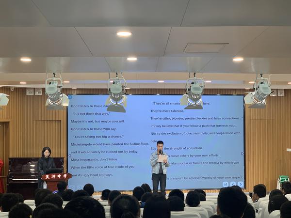 在一个多小时的讲座中,我校英语学院团委书记宋雪梅结合自身担任高中英语教师和作为高校学生辅导员的双重经历,通过深入浅出地分析,让高中生明白英语学习需要日积月累、总结反思,探索最适合自己的学习方式。她还分享了天外优秀学子的鲜活故事,让高中生认识到职业生涯规划的重要意义。英语学院诗歌社的动情朗诵和演讲社的精彩英文电影配音让互动环节更加热烈。我校学子不仅用流利的英语点燃了现场氛围,更用青春寄语表达了对学弟学妹的无限期待。