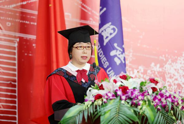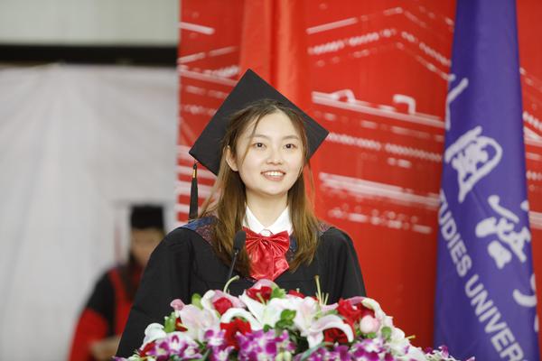 欧洲语言文化学院王佳鑫代表全体在校生发言,国际关系学院本科生王昕宇、国际教育学院硕士留学生达利娅、英语学院博士生刘璇代表2021届全体毕业生发言。82届优秀校友、瑞尔集团创始人兼总裁邹其芳,我校“我的良师益友”获得者、“英七七校友校长特奖”优秀教师、求索荣誉学院常子霞分别致辞。毕业生代表用诗朗诵《青春心向党》为母校和党献上最真挚的祝福。
