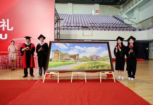 由人工智能音乐机器人乐团演奏的《智·未·来》拉开了毕业典礼的帷幕,科技与音乐的奇妙结合为典礼现场营造了和谐欢快的氛围。体育馆里,33种外文书写的毕业祝福标语环绕四周,一面面手持的国旗和党旗迎风招展,看台上毕业生拼出“TF?SU”惊艳亮相。现场播放了各学院精心制作的视频《青春无悔 不负韶华》、毕业视频《我心依旧 初心依然》,学子们看后流下了激动的泪水。