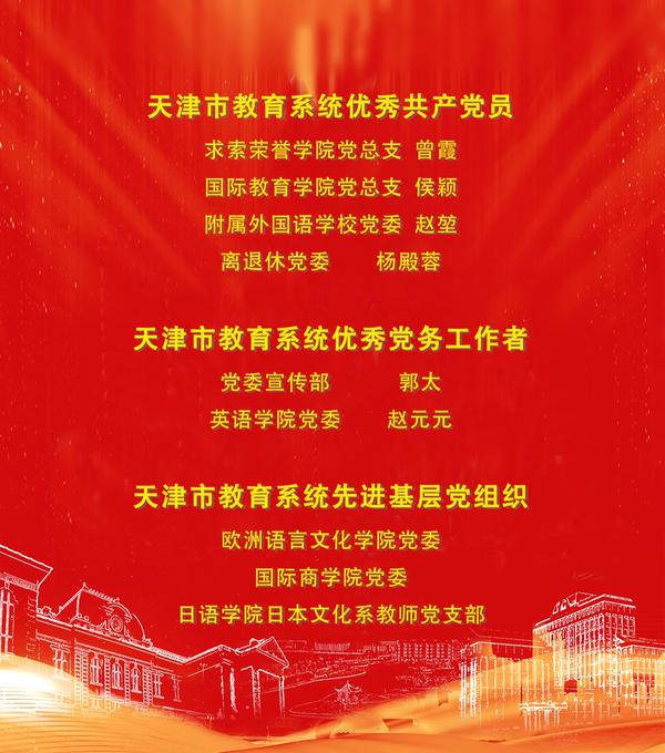 为隆重庆祝中国共产党成立100周年,6月28日下午,天津市教育系统“两优一先”表彰大会在天津师范大学隆重召开。市委常委、市委教育工委书记王庭凯出席并讲话。市委教育工委专职副书记孙志良主持会议。会上宣读了《市委教育工委、市教委关于表彰天津市教育系统优秀共产党员、优秀党务工作者和先进基层党组织的决定》,并为“光荣在党50年”的老党员代表颁发了纪念章,为优秀共产党员、优秀党务工作者和先进基层党组织代表进行了颁奖。我校党委书记殷奇出席表彰大会,“光荣在党50年”老党员代表李长海、校党委常委、党委宣传部部长、网信办主任郭太、欧洲语言文化学院党委书记安娜、国际教育学院教师侯颖作为获奖代表参加会议。