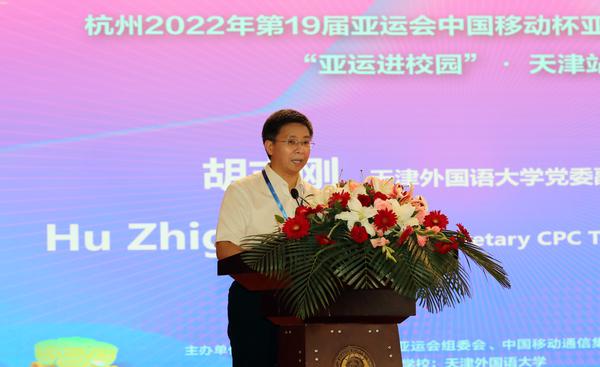 正值全国人民欢庆中国共产党百年华诞之际,7月2日,我校携手杭州亚组委、中国日报社、21世纪报社及中国移动通信集团有限公司,在马场道校区大学生活动中心举办杭州2022年第19届亚运会中国移动杯亚运英语之星大赛“亚运进校园”天津站宣讲活动。杭州亚组委外联部副部长徐剑锋, 21世纪报社总编辑曾庆锴,21世纪英语教育传媒总经理王蕾,中国日报社天津记者站首席记者杨成,校党委副书记胡志刚出席,各学院学生代表、校学生会骨干等200余人参加了宣讲会。会议由校团委书记梁燕主持。