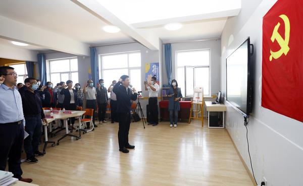 党日活动中,胡志刚带领与会党员在党旗下重温入党誓词。