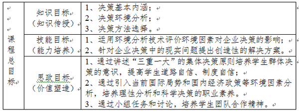 本节课程贯彻立德树人的教育理念,将价值塑造、知识传授和能力培养融入教学过程,最终实现专业建设与课程思政的融合创新。教师通过理论讲授帮助学生理解和掌握决策理论与方法;将环境分析与管理决策的知识点有机融合,培养学生对国内外形势和时事热点的敏感性;通过典型企业决策的案例讨论和小组主题报告,培养学生的分析能力、表达能力和团队合作能力等综合素养。