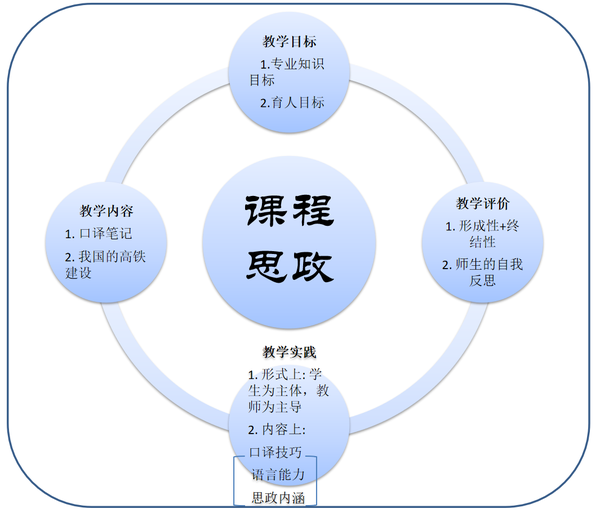 课程目标的制定将专业目标和育人目标放在同等重要的位置。教学内容设计上,课堂以时政分享开始,以师生互动的形式讨论我们身边的时政要闻。此外,教师结合本单元主题,将我国高铁建设的伟大成就和背后故事有机融入口译笔记的学习,选取有关中国高铁的音视频帮助学生学习口译笔记,在学习和练习口译技能的同时,领略高铁这张中国时代名片的魅力,体会个人发展与国家发展的紧密结合。教学评价采用形成性和终结性评价相结合的模式,引导学生及时进行反思,实现学生对口译笔记知识学习和思政提升的自我构建。