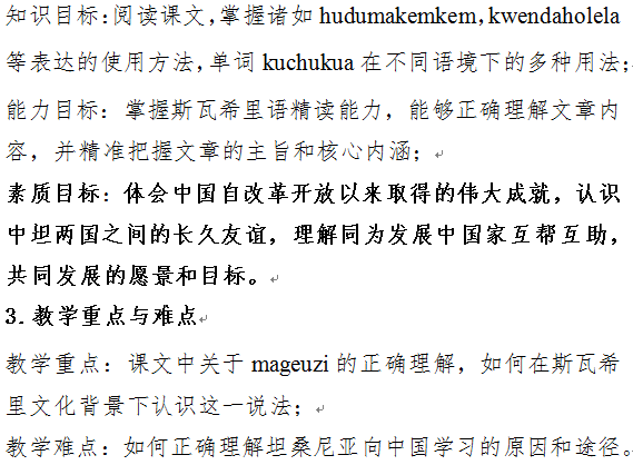 通过本节课程学习,学生熟练掌握本课词汇语法等相关内容,提高斯语阅读能力。通过认识和学习在中国共产党的领导下,中国自改革开放以来取得的伟大成就,培养学生的爱国情操,增加国家认同感和民族自尊心,拥护党的领导和路线方针,将中华民族伟大复兴视为己任。通过回顾中坦两国的友好交往历史和深厚友谊,正确认知中非双方继往开来、彼此合作、取长补短、共同发展的美好愿景。作为学习非洲语言的中国学生,能够肩负历史使命,在现今“一带一路”的倡议下,积极投身其中,成为双方友好沟通交流的桥梁,为中非共同发展的目标贡献力量。