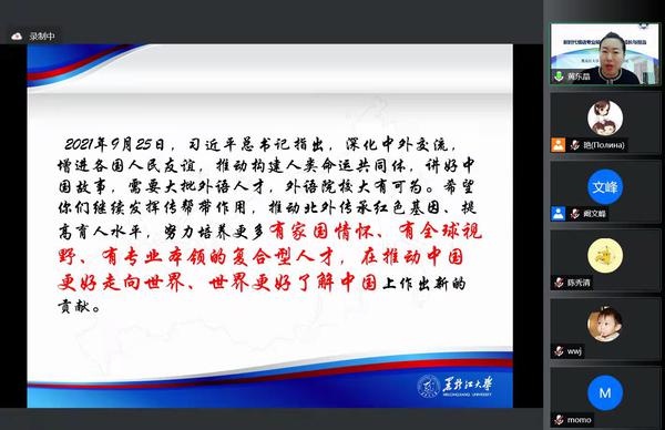 近日,黑龙江大学俄语学院党委书记黄东晶教授应邀作客我校“研究生培养与质量提升”系列讲座,以《新时代俄语专业硕士研究生的成长与担当》为题,与欧洲语言文化学院俄语学科师生进行了线上交流与分享。讲座由欧洲语言文化学院副院长史亚军教授主持,俄语学科师生80余人参加此次活动。