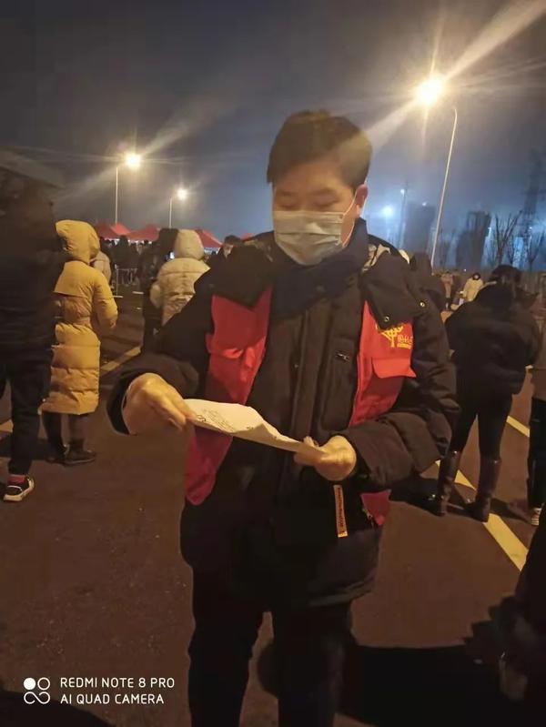 1月8日凌晨4点,他已经在居委会开始工作,与其他分配到小区的工作人员一同上岗。“您好,请保持一米的距离;您好,请出示您的健康码;您好,请先扫码录入您的个人信息......”一声一声的提醒、一人一人的检查、一个一个的录入,他就是这样以实际行动投身志愿服务,用青春担当筑起抗疫防线。直到1月9日凌晨3点,他完成了23个小时的高强度工作。尽管冻得瑟瑟发抖,但居民自发送来的热水与其他热饮,使他坚信疫情无情人有情,情在人间暖人心。