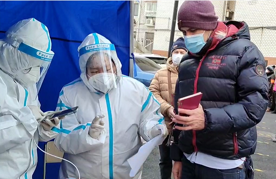 早晨7点,俄语系党员教师国晶开始在小区进行志愿服务,喊大喇叭,挨家挨户敲门,按顺序引领小区居民下楼做核酸,协助社区在四个半小时之内完成了3500余人的核酸检测。