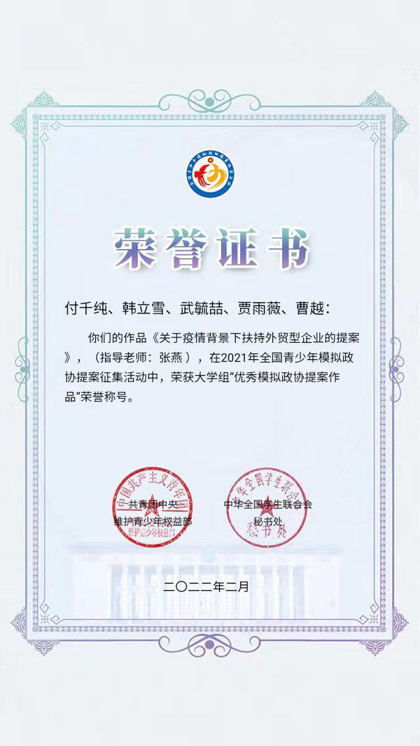 2月18日,经过省级团委推荐、团中央初审、专家评审、网络点赞、评审会集体终审等环节,2021年全国青少年模拟政协提案征集活动评审结果揭晓。我校国际商学院经济学(中外合作)专业学生团队的提案作品“关于疫情背景下扶持外贸型企业的提案”成功入围全国前100名,荣获“优秀模拟政协提案作品”,也成为天津市唯一入围的大学组提案。