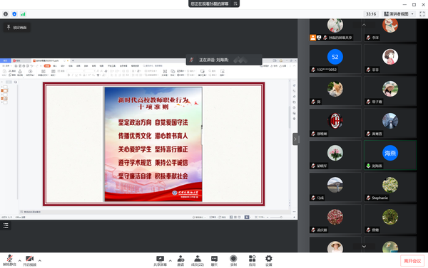 各二级党组织通过线上线下等多种形式组织开展主题宣讲、警示教育、交流讨论,扎实开展师德师风宣讲,围绕“十项准则”和“处理办法”等主要内容,结合教育部近期通报曝光的违反师德典型案例,教育引导全校教职员工时刻牢记教师身份,在工作、生活各个方面严格遵守“十项准则”要求,严守师德底线,时刻自重、自警、自励,以案为警、以案为戒,不断增强依法执教意识,将良好师德师风作为立身从教的首要标准,不忘初心、牢记使命,努力做无愧于党、无愧于人民的“四有”好老师,当好学生成长成才的引路人。