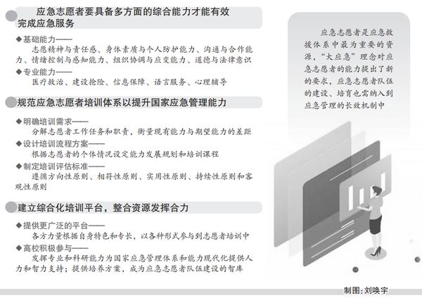 为适应全风险、全过程、全主体、常态化的新型应急管理理念,应急志愿者要具备多方面的综合能力才能有效完成应急服务。
