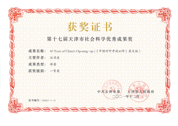 2019年第十六届天津市社会科学优秀成果二等奖获得者;出版重要学术和政治理论译著20余部,主持国家社会科学基金中华学术外译项目1项。