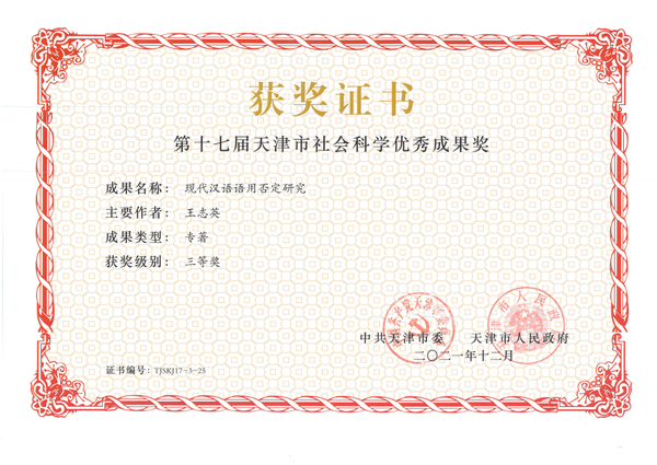 该成果荣获第十七届天津市社会科学优秀成果奖三等奖,证书编号:TJSKJ17-3-25。
