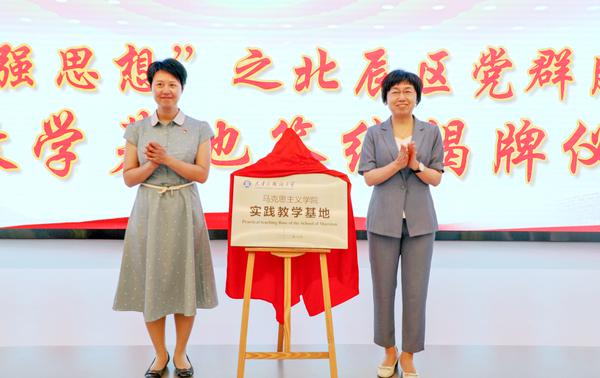 下午,全体师生党员循着“红色印记”来到集党建示范、党员教育、服务群众、智慧管理等功能于一体的新型党建综合体------北辰区党群服务中心。在北辰区委组织部、宣传部的大力支持下,举行了“‘行走的最强思想’北辰区党群服务中心实践教学基地”签约揭牌仪式。师生党员在场馆内进行参观学习,在历史与现实的映照中、在故事与实物的交融中、在图片与影音的融合中,了解中央和天津在革命、建设和改革过程中的大事件,切身感受到北辰区经济社会高质量发展和新时代乡村振兴的累累硕果。师生党员与北辰区委组织部相关领导共同观看了北辰区退役军人艺术团文艺表演,《我的祖国》《骏马奔驰保边疆》《精忠报国》、《红灯记》选段……一个个曲目激情磅礴,点燃全场热情。活动在《没有共产党就没有新中国》的全体大合唱中精彩落幕。