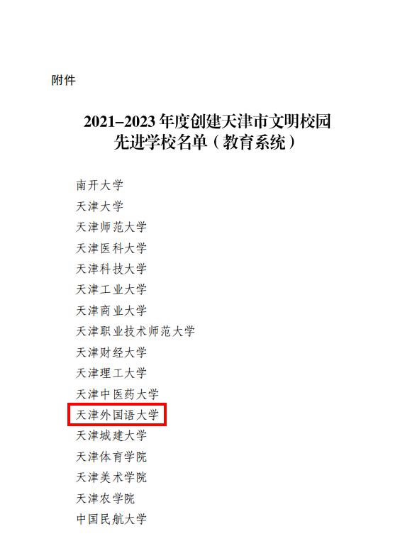 近年来,学校高度重视精神文明创建工作,成立文明校园建设委员会,研究推动创建工作,持续深化师生精神文明教育,不断提升师生文明素养,涵养独具天外特色的校园文化。学校将以此次获评创建天津市文明校园先进学校为新的起点,加强统筹协调,不断推进文明校园创建,激励广大师生投身学校各项事业发展和“五个现代化天津”建设,以优异成绩迎接党的二十大胜利召开。