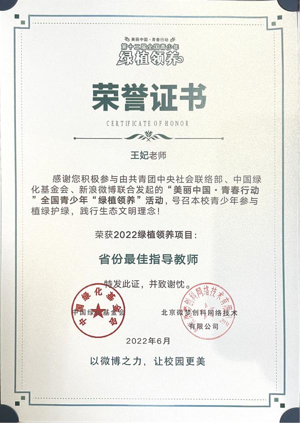 近日,由我校网信办指导的天外微博协会联合学工通讯社在“第十二届全国青少年绿植领养活动”中获得“省份最具公益力高校”称号,网信办王妃老师获“省份最佳指导教师”称号。