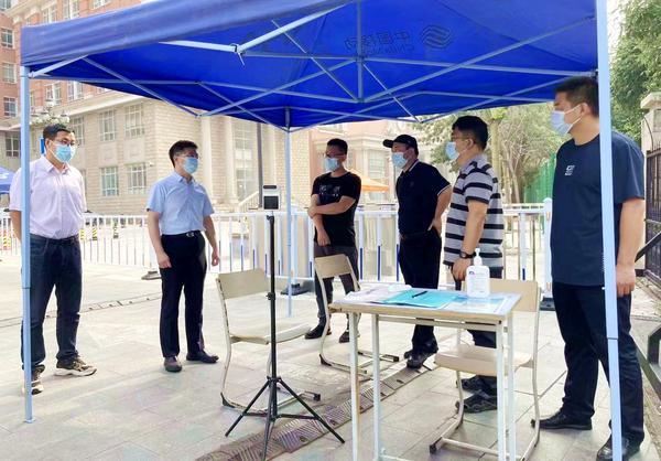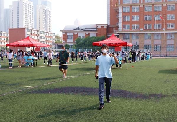 除了大白,还有一群清晨便早早上岗,开始统计名单、布置现场、维持秩序、保障安全的党员突击队志愿者们。他们奔走在烈日下,晒黑了皮肤,喊哑了嗓子,顾不上喝口水歇一歇,圆满完成了三天两校区返校学生共计16348人次的核酸检测任务。