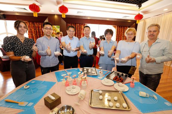 与会人员在面点师的指导下,亲身体验了如何制作月饼,感受到了中国传统美食的魅力。欧洲语言文化学院葡语系外籍教师黎颂明作为外籍教师代表发言,她表示,2022年中国的传统节日中秋节恰逢教师节,能够受邀参加活动感到非常荣幸,虽然面临新冠肺炎疫情等困难,但相信天津一定会战胜疫情,祝大家节日快乐,“千里共婵娟”!