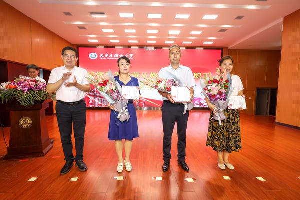 与会校领导为本科教学质量优秀奖获得者、第四届“三育人”先进工作者及标兵获得者、光荣从教三十年教职工代表颁发证书。每一项荣誉的取得,都源于老师们言传身教、春风化雨;每一项荣誉的背后,都有一段默默坚守的感人故事。他们坚定践行“四有好老师”“四个引路人”和“四个相统一”要求,辛勤耕耘在立德树人、教书育人一线,展现出天外教师无私奉献的使命担当和昂扬向上的精神风貌。