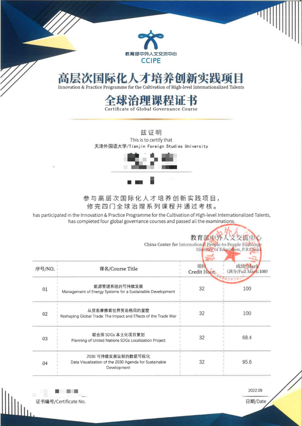 课程考核通过后,每门课程可认定为1学分的校内相关课程学分。按录取课程完成学习并通过考核的学生,本科生可获得由学校教务处和国际合作与交流处联合颁发的高层次国际化人才培养创新实践项目课程修读证书,研究生可获得由研究生院和国际合作与交流处联合颁发的高层次国际化人才培养创新实践项目课程修读证书。学完4门全球治理课程且成绩合格者,可获教育部中外人文交流中心颁发的相应证书。