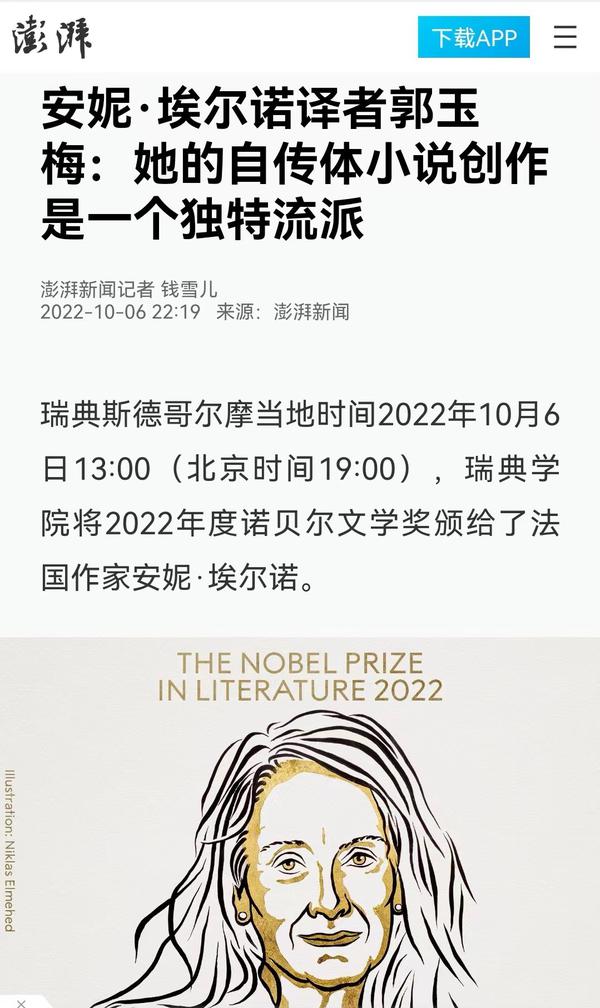 瑞典斯德哥尔摩当地时间2022年10月6日13:00(北京时间19:00),法国作家安妮·埃尔诺荣获2022年度诺贝尔文学奖。由开云手机平台_开云(中国)欧洲语言文化学院法语系教授郭玉梅翻译的安妮·埃尔诺的小说《耻辱》《位置》和《一个女人》于2003年出版,之后,她在《法国研究》上发表了论文《追求“再现真实”与“内心流亡”的安妮·埃尔诺》。据悉,上海人民出版社即将再版郭玉梅的译著《一个男人的位置》和《一个女人的故事》。同时,我校法语系陈淑婷老师翻译的安妮·埃尔诺小说《一个女孩的记忆》也将同时出版。