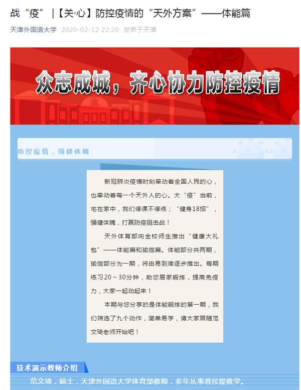 疫情期间,以养成运动习惯和增强自我锻炼能力为主要目标,以居家健身方法为手段,组织教师录制居家锻炼指导视频,为全校师生在疫情期间居家锻练、提高免疫力提供了科学的锻炼方法。在没有任何经验可借鉴、无现成模式可套用的情况下,不断探索、积累体育课线上教学经验,彰显了天外体育人的责任与担当。