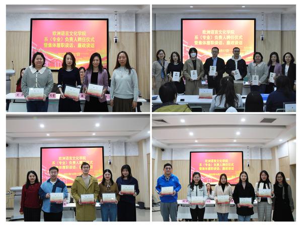 为落实校党委关于开展2022年党风廉政建设宣传教育月暨“担当迎盛会 清廉润天外”主题活动的工作要求,扎实推进党风廉政建设,积极营造良好政治生态和学院发展环境,10月17日下午,欧洲语言文化学院召开系(专业)负责人聘任仪式暨集体履职谈话、廉政谈话。学院班子成员和各系(专业)负责人参加会议。会议由学院党委书记安娜主持。