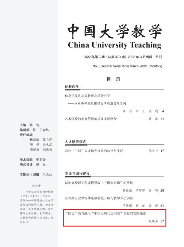 学术论文《“四史”教育融入“中国近现代史纲要”课程的实践探索》发表于期刊《中国大学教学》2022年第3期,该刊为CSSCI扩展版、北大核心来源期刊,ISSN号为1005-0450。