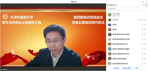 为深入学习宣传贯彻党的二十大精神,用马克思主义中国化最新成果武装青年,培养造就一批对党忠诚、信仰坚定、素质优良、作风过硬的青年政治骨干,12月9日,我校举行了“青年马克思主义者培养工程”第四期培训班结业式暨第五期培训班开班式。校党委副书记胡志刚出席,党委学工部部长、校团委书记梁燕,各学院团委书记,我校“青马工程”第四期、第五期培训班学员,往届青马班优秀学员代表等百余人相聚云端、共话信仰。会议由校团委副书记于凯主持。