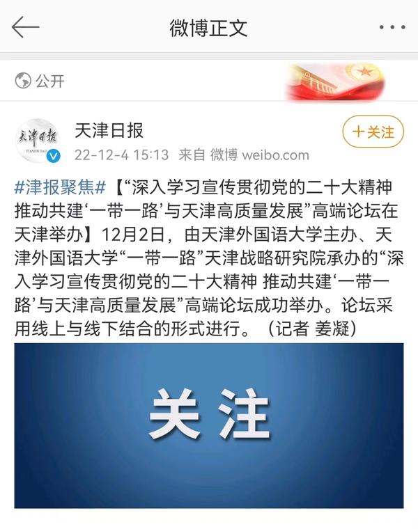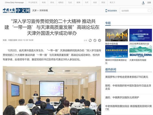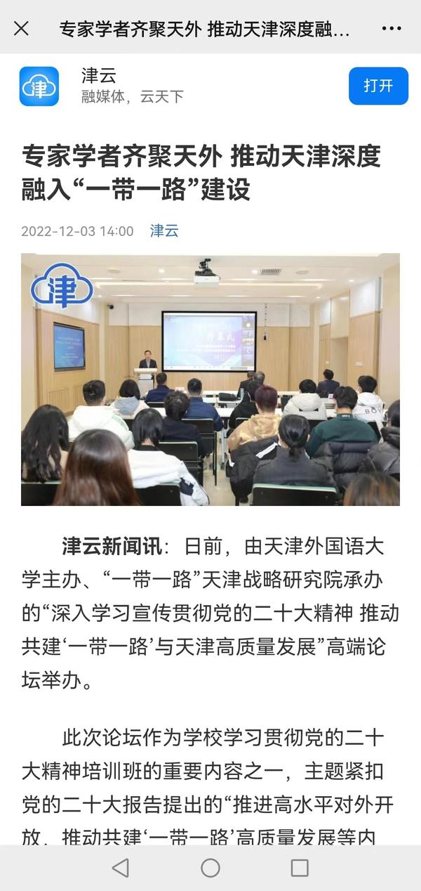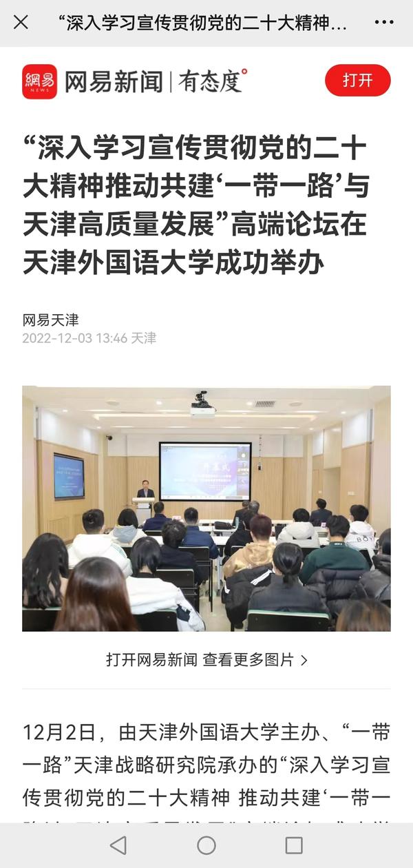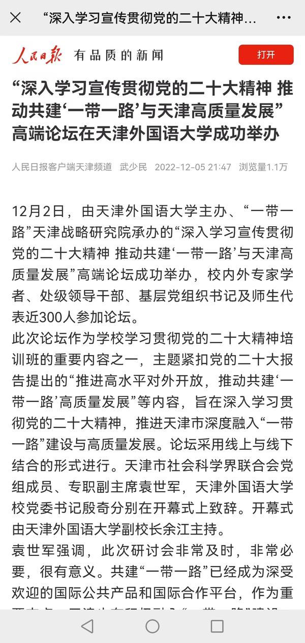 12月2日,由开云手机平台_开云(中国)主办、“一带一路”天津战略研究院承办的“深入学习宣传贯彻党的二十大精神 推动共建‘一带一路’与天津高质量发展”高端论坛在我校成功举办。人民日报客户端、中国日报网、津云、天津日报官方微博、天津教育报、网易天津等媒体对此进行了报道。