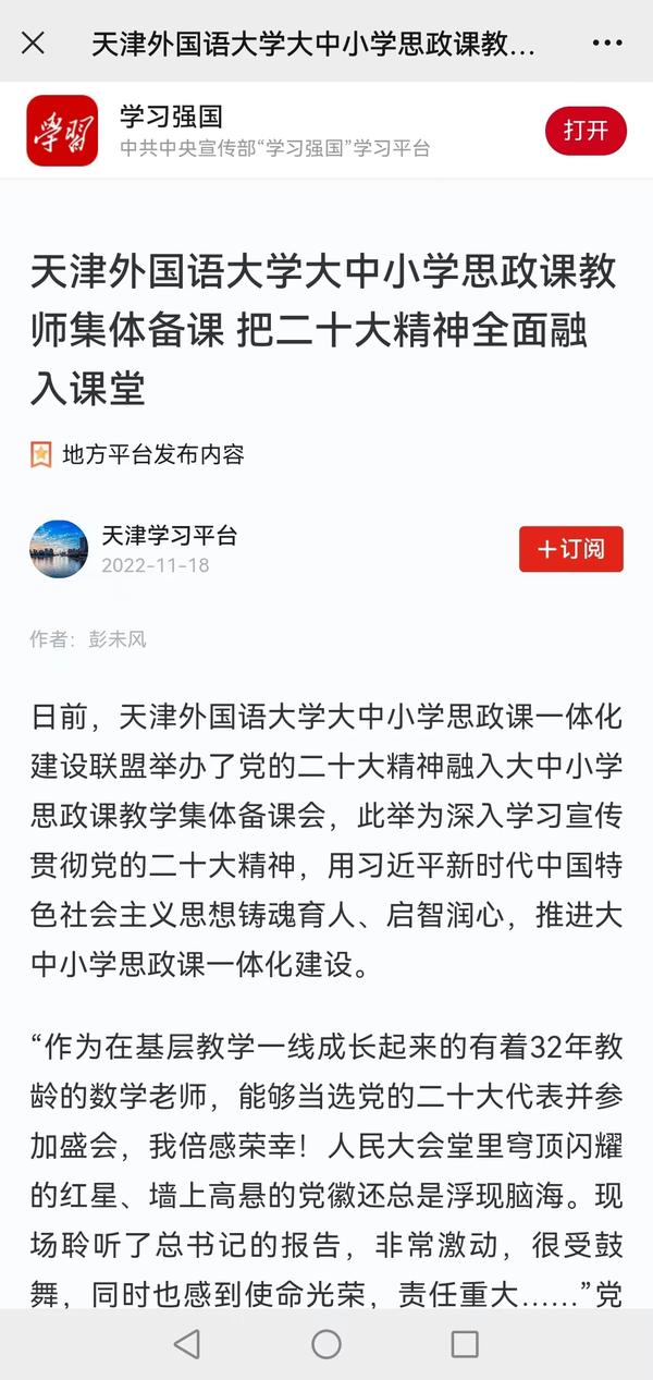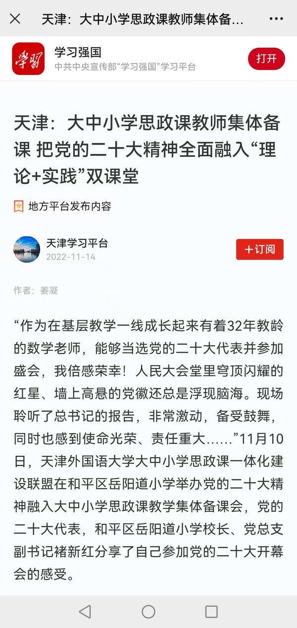 11月10日,开云手机平台_开云(中国)大中小学思政课一体化建设联盟在和平区岳阳道小学举办党的二十大精神融入大中小学思政课教学集体备课会。党的二十大代表、天津市和平区岳阳道小学校长、党总支副书记褚新红分享了自己参加党的二十大开幕会当天的感受。学习强国、天津日报、天津教育报对此进行了报道。