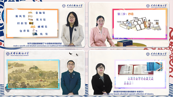 2022年9月,在我校国际合作与交流处大力支持协作下,图书馆首次成功申报汉语桥线上团组交流项目。全馆上下高度重视,周密筹备,秉承“一带一路”倡议所倡导的“包容互鉴”精神,依托馆藏和专业优势,立足于向“一带一路”沿线国家和全世界中文爱好者推介中文古籍保护知识,14名馆员参与项目的策划实施。项目一经上线,海外学员报名踊跃。来自24个国家的150余名注册学员汉语水平参差,为保证教学质量,图书馆迅速调整教学计划,将学员分至三个班级,直播课程时长相应从12课时增至36课时,由7位不同专业背景的馆员作为授课教师有针对性地开展教学。学员在课上学习汉语基础知识、了解“年”文化与天津地方民俗,从“云”端概览中国古代藏书楼,共同诵读《诗经》、《朱子家训》等中国文化启蒙典籍,在“雅”、“俗”间一览中国传统文化的博大精深。