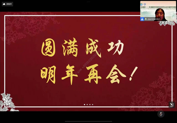 为期八天的“天津都市风情与经济社会”汉语学习之旅完美收官。八天的时间里,求索荣誉学院教师对天津的商业经济、社会发展和文化旅游特色进行了全方位讲解,带领学员领略了天津的美,感悟了天津的情,认识了天津的趣。这是一场天津经济发展和商务汉语知识的盛会,也是一次天津历史文化之旅。伴随着老师们“兔年吉祥”“万事如意”的祝福和学员们“谢谢老师”“中国见”的感激之情,此次线上交流项目圆满收官。祝愿学员们以此次学习为基础,在中国文化学习之路上继续扬帆起航!