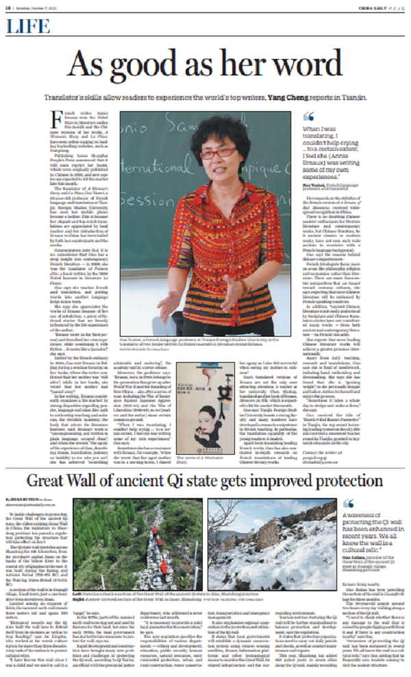 瑞典斯德哥尔摩当地时间2022年10月6日13:00(北京时间19:00),法国作家安妮·埃尔诺荣获2022年度诺贝尔文学奖。开云手机平台_开云(中国)欧洲语言文化学院法语系教授郭玉梅作为安妮·埃尔诺的小说《耻辱》《位置》和《一个女人》的译者,以及另一位诺奖得主、2008年荣获诺贝尔文学奖的勒·克莱齐奥所创作的《金鱼》一书的译者,接受了中国日报社天津记者站站长杨成的采访。《As good as her word》一文在中国日报、网、端、海外社交媒体刊发,海外落地,受到国内外广泛关注,各大媒体进行了采访报道。郭玉梅教授数十年如一日,字斟句酌,精益求精,用一部部呕心沥血、文辞隽永的译著为中外文明交流互鉴架起“心桥”。中国日报社通过全媒体手段让中国故事“活”起来,让典型人物“火”起来,对内进一步增强了文化自信,对外强化了中华文明传播力影响力,推动中华文化更好走向世界。该新闻先后受到了人民日报、天津日报、津云等多家媒体的转载报道,澎湃新闻、深圳特区报、上海文汇报等多家媒体对郭玉梅进行了采访报道。